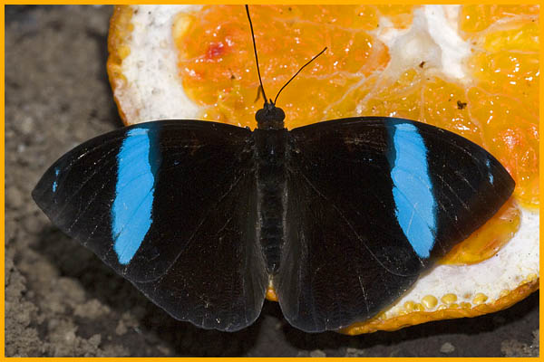 DESCRIZIONE: La pagina superiore delle ali di questa farfalla è nera con una vistosa banda obliqua azzurra sulle ali anteriori. Nei maschi è inoltre presente una chiazza arancione sulle ali posteriori. La pagina inferiore è invece verde, con striature nere ed una banda obliqua bianca sulle ali anteriori. L’apertura alare è compresa tra 60 e 67 mm.