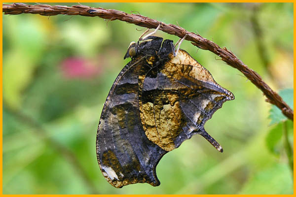 DESCRIZIONE: Quando è posata con le ali chiuse, questa caratteristica farfalla somiglia perfettamente ad una foglia secca. Questo grazie alla particolare colorazione bruna, al contorno frastagliato delle ali e alla presenza sulle ali posteriori di due sottili code, simili al picciolo di una foglia. Superiormente invece presenta una vistosa colorazione arancione e nera con chiazze gialle. L’apertura alare è compresa tra i 70 e i 100 mm.