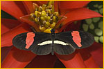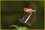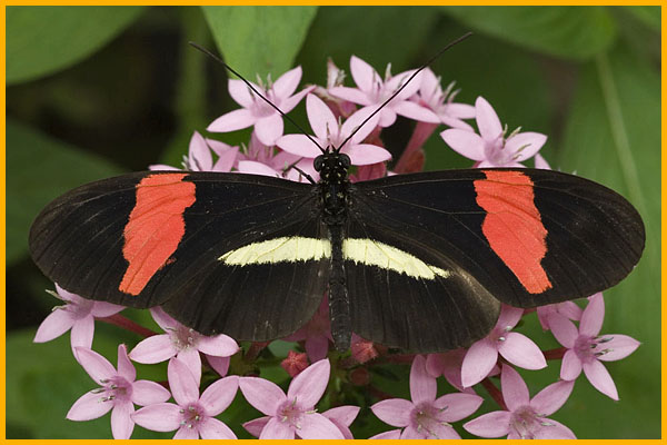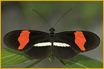 DESCRIZIONE: La colorazione delle ali anteriori di questa farfalla è nera con una larga fascia trasversale rossa. Quelle posteriori sono invece nere con una sottile fascia longitudinale gialla. La livrea è molto simile a quella H. melpomene, dalla quale si differenzia principalmente per la fascia delle ali posteriori che raggiunge il margine superiore dell’ala. Entrambe le specie rappresentano un esempio di mimetismo Mülleriano.